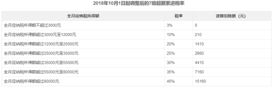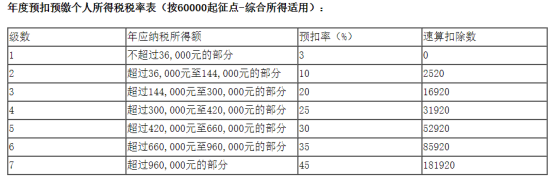 適用工資、薪金的個人所得稅采用七級超額累進(jìn)稅率,也就是根據(jù)個人的薪資劃分為七個等級,不同等級的稅率不同,最低一級為3%,最高一級為45%,具體如下: