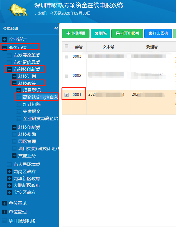 2、登陸后,依次選擇“業(yè)務申請”、“市科技創(chuàng)新委”、“科技政策”、“高企認定(培育入庫)”選項。